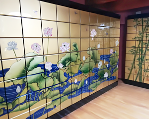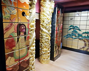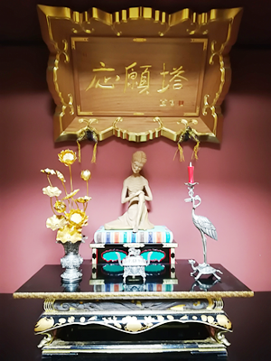 応願塔院納骨堂は平成29年に新築された、200年耐用の耐震設計がなされた伝統工法により建立された木造本堂の地下にあります。屋根は本邦初のステンレス葺き、正面の自動ドアより入堂するとバリアフリー、全席椅子席、冷暖房完備と、現代の参詣事情に沿って設計されています。後堂(裏側廊下)にある納骨堂入り口より、地下へ階段を降りた場所に納骨堂が位置します。豪華な金龍柱の間に安置される、堂内本尊「五劫思惟菩薩像」を囲むように納骨壇があります。本尊両脇には舞楽図、右側は散手、左側は胡飲酒の舞人が描かれています。背面には蓮と蜻蛉、側面には竹と雀、松と雁、全て薩摩の名工・吉永正人氏(吉永工芸代表)による漆上に金粉で加飾した格調の高い蒔絵となっています。氏の渾身の作品の芸術性を損なわないように、鍵穴や取手などは設置してありません。